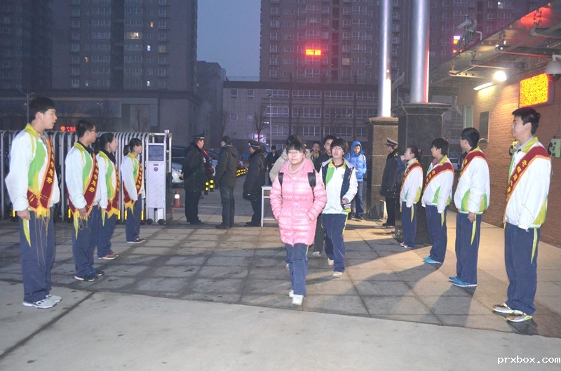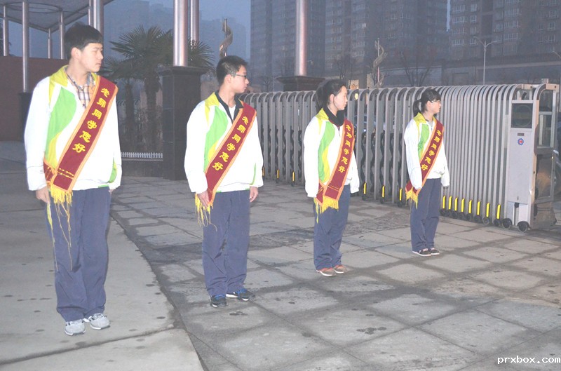 文明督导员站立整齐,向老师和同学问好