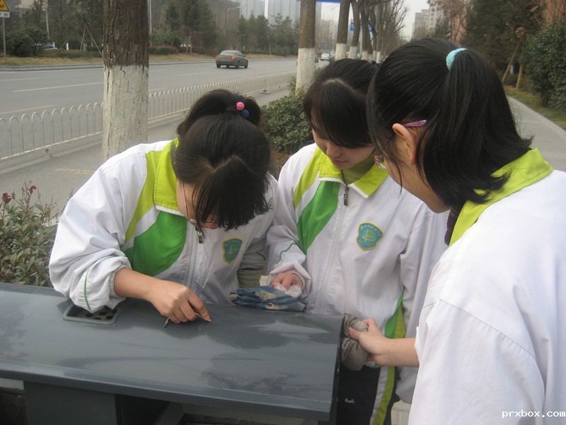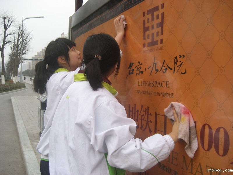 在班干部与同学的共同协商下,考虑到实际和安全问题,班委决定把活动地点定在环绕校园一圈的路段上,重点清理凤城五路和文景路菁华名门门口的共计四个公交站牌,沿路的数个垃圾桶、路牌和栏杆。在分组落实任务之后,喧闹的同学们都安静下来,迅速投入了劳动中。拿着抹布细细清理着污渍和卫生死角,特别是沿路的野广告。