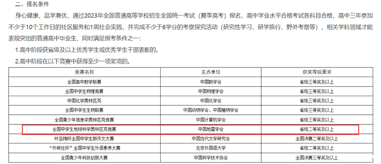 现有部分高校的综合评价招生简章中将地球科学奥赛的成绩作为报名条件,包括浙江大学、中国海洋大学、中国石油大学(华东)、青岛大学等。以中国石油大学(华东)所公布的2023年综合评价招生简章为例,在报名条件一栏,明确提及了在全国中学生地球科学奥林匹克竞赛省级二等奖及以上的成绩,可作为报考条件。